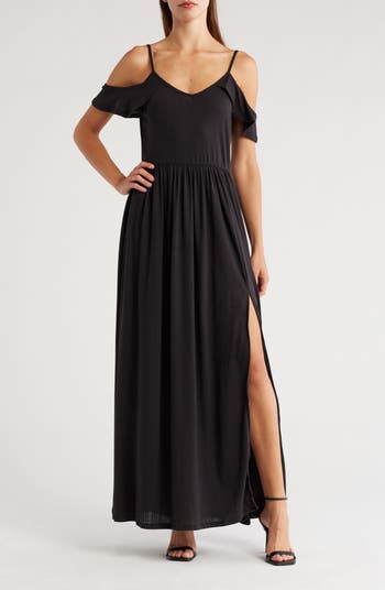 Win best-dressed at brunch in this flowy maxi dress that's framed by cold-shoulder sleeves sweetly edged in ruffles.