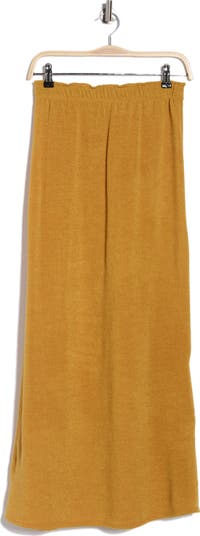 A single slit offers a peek of leg in this maxi skirt topped with a ruffled elastic waistband.