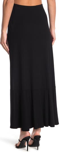 A dramatic ruffle shapes a high/low maxi skirt with a front cutout for feminine style.