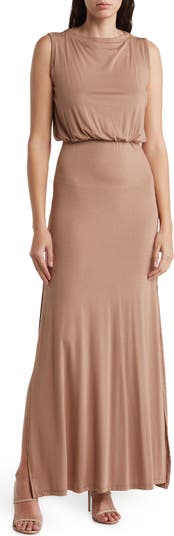 Go casual in this sleeveless maxi dress cut from a soft, stretchy knit with a draped blouson waist and sultry side slit.