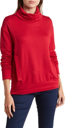 A banded hem helps shape a cozy turtleneck sweater that features front welt pockets.