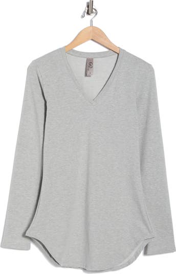 A V-neck and curved hem frame the fitted silhouette of this long-sleeve T-shirt cut from soft knit.