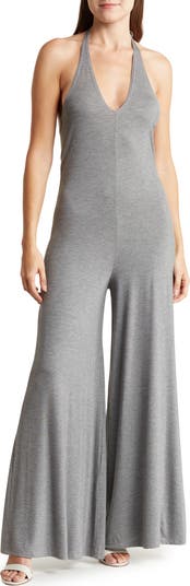A wide-leg jumpsuit is topped with a halter neckline that exposes your back for skin-baring appeal.
