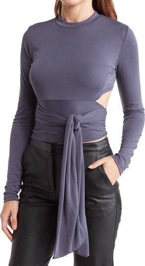 A wrap detail gives a striking appearance to a long sleeve top cut from irresistibly soft knit fabric.