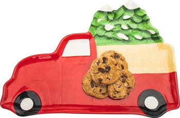 Serve Santa some of his favorite cookies on this festive platter shaped like a red truck carrying a Christmas tree.