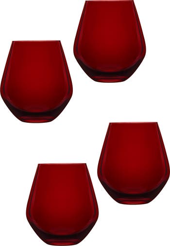 This set of contemporary stemless wine glasses made from richly hued lead-free crystal is perfect for enjoying vino with friends.