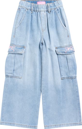 They’ll love to play it cool in these pull-on denim jeans with bow-embroidered cargo flap-patch pockets.