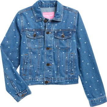 They'll adore layering on this stretchy denim jacket covered in hearts.