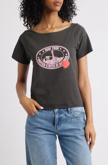 A playful graphic is affixed with a heart on a raglan-sleeve cotton T-shirt that celebrates the city that never sleeps.