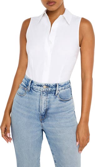 Elevates any look with this essential bodysuit featuring a crisp cotton-poplin fabrication, sleeveless silhouette and smart point collar.