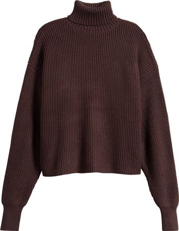 This warming ribbed turtleneck sweater features an on-trend slouchy fit that'll keep you cozy and cute.