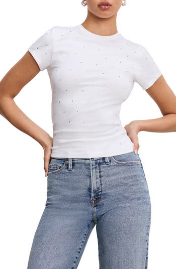 Crystals scatter light across this stretchy cotton baby tee that'll add understated sparkle to your ensemble.