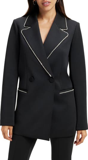 Make a sparkling impression at your next soirée in this double-breasted blazer cut from stretchy scuba fabric embellished with eye-catching crystals.