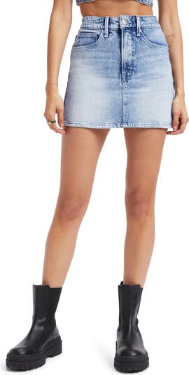 A classic rise punctuates this faded-denim miniskirt designed with shapely, easy-moving stretch.