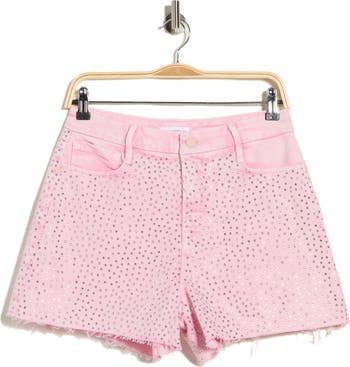 Sparkling crystal embellishment bring a touch of glamour to these high-waisted shorts cut from pink stretch-kissed denim with raw edges.
