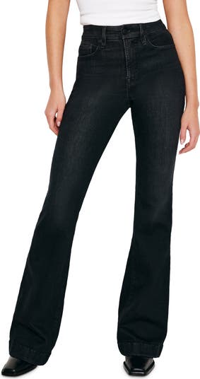 These shapely jeans in a retro flare-leg silhouette feature a gap-proof waist, a versatile dark wash and tonal details.