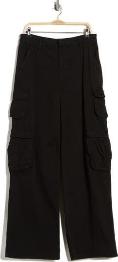 Show off high-waisted flat-front pants fashioned with cargo pockets for trendy style.