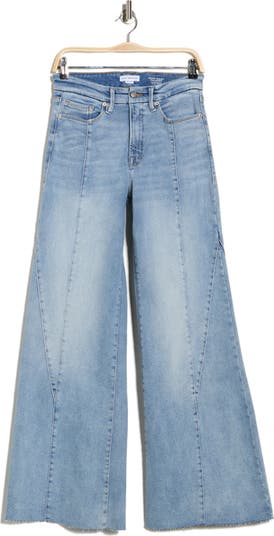 Diagonal and straight seams cut through these high‑waisted palazzo jeans crafted from light‑washed stretch denim.