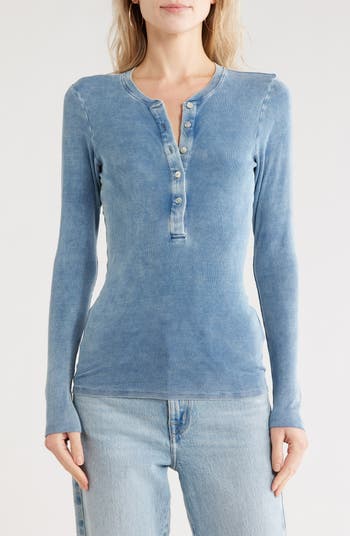 Get comfy in your down time with a fitted henley top made from soft, stretchy ribbed jersey in a denim-inspired wash.