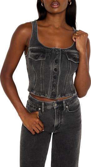 Cotton French terry brings utter comfort to a corset-inspired top that borrows its look from traditional denim detailing with chest pockets and raised seams.