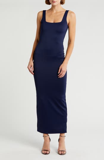 Minimalism meets glamour in this streamlined scuba-knit dress cut in a figure-hugging silhouette with a square neck and thigh-high back slit.