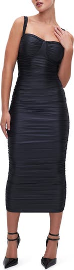 This curve-hugging body-con dress boasts seamed cups for a contoured look and ruched details for extra texture.