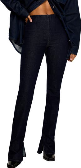 A superhigh, flat-front waist and side-slit, floor-sweeping legs give these stretch-denim flare pants a sleek, figure-elongating look.