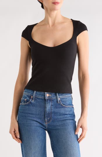 A superstretch V‑neck T‑shirt delivers effortless comfort with its smooth fit and flattering cap sleeves.