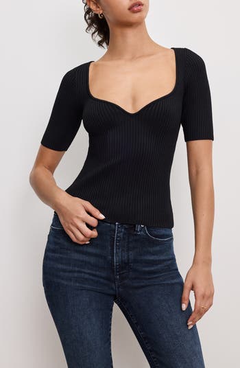 Stretchy ribbed fabric flaunts every curve in this svelte top framed by a clavicle-baring sweetheart neckline.