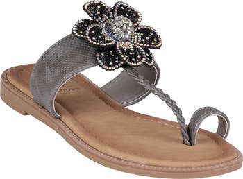 A jewel-encrusted floral appliqué and stylish toe ring add whimsical appeal to a charming sandal set on a cushioned footbed for comfortable wear.