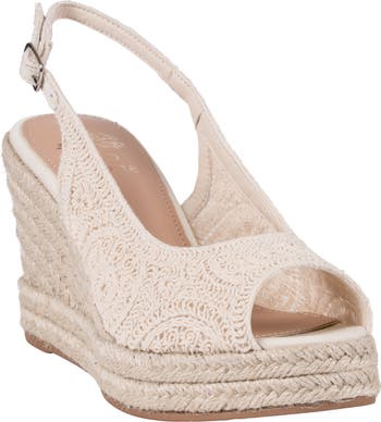 A lace-inspired texture distinguishes a slingback sandal set on a towering espadrille wedge and platform that serves up unmistakable summer charm.