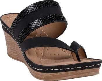 Elevate your warm-weather ensembles with this chunky wedge sandal sprinkled with sparkly rhinestones and set on a cushioned footbed.