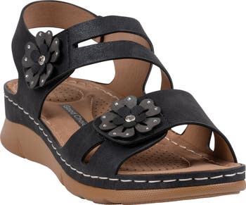 Flower accents add a summery vibe to this strappy sandal that keeps you comfortable with its cushioned footbed and grippy sole.