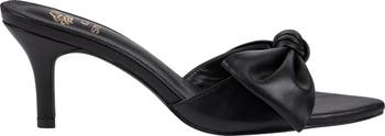 A knotted bow lends coquettish glamour to the vamp of a slide sandal set on a skimpy stiletto heel and framed by a pointy toe.