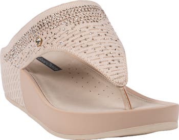 Shimmering rhinestones illuminate the woven vamp strap of a summery sandal set on a low wedge and platform that are easy to walk on.