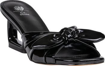 A knotted upper bow and architectural heel bring artisanal charm to a cushioned slide sandal shaped from high-shine faux leather.