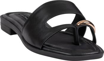 Polished hardware on the toe loop emphasizes the modern appeal of this faux-leather sandal built with soft cushioning to make it an instant favorite.