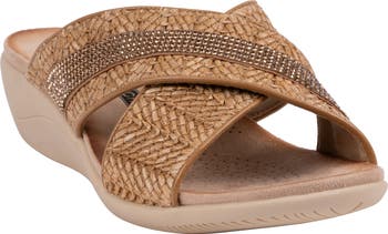 Sparkling crystals bring subtle shine to the woven crisscrossed straps of this sandal balanced upon a wedge heel.