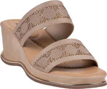 Shimmering rhinestones illuminate the woven straps of a summery sandal set on a chunky wedge that brings a perfect amount of lift to any look.
