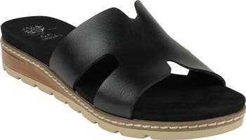 Geometric cutouts bring subtle dimension to the upper of a faux-leather slide sandal set on a slight platform and modest wedge heel.