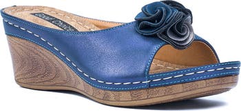 Dimensional flowers bring a colorful, feminine twist to the Sydney slip-on sandal from GC Shoes. A woodgrain platform wedge heel adds casually chic style. Sizing: true to size. M=standard width - Open toe - 3D floral embellishment - Slip-on style - Lightly cushioned footbed - Topstitched accent - Woodgrain platform wedge heel - Approx. 2.5" heel, 0.75" platform - Imported