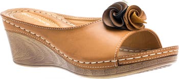 Dimensional flowers bring a colorful, feminine twist to the Sydney slip-on sandal from GC Shoes. A woodgrain platform wedge heel adds casually chic style. Sizing: true to size. M=standard width - Open toe - 3D floral embellishment - Slip-on style - Lightly cushioned footbed - Topstitched accent - Woodgrain platform wedge heel - Approx. 2.5" heel, 0.75" platform - Imported
