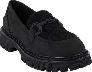 A faux-shearling vamp brings cozy vibes to a soft loafer fashioned with a textured metallic bit and lugged platform sole for contemporary appeal.