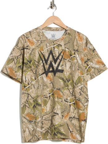 Perfect for any WWE fan, this cool camo-patterned T-shirt features a bold logo graphic front and center.