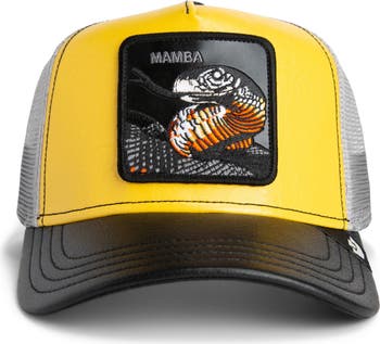 An embroidered mamba patch brings eye-catching flair to this court-inspired trucker cap featuring breathable mesh panels and a curved faux-leather brim.