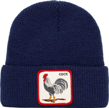 If you can't wear your heart on your sleeve, wear this cock on your head as it struts across the cuff of a beanie made with soft, warm wool.