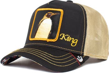 An austere penguin wins big on the crown of a trucker hat made with a mesh back, a stretchy fit, and colorful casino chips cashing in on both sides of the bill.