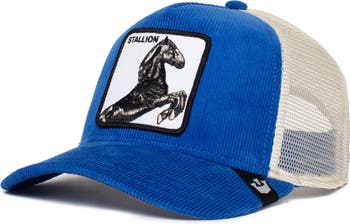 A noble stallion lets you shout till you're a little horse in a trucker hat made with soft corduroy blocking the sun and lightweight mesh inviting the breezes.
