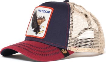 An embroidered patch fronts a classic trucker hat constructed with mesh paneling at the sides and back.