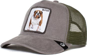 A very good dog makes it easy to sit up and shake in a trucker hat crafted with chunky corduroy blocking the sun and lightweight mesh inviting the breezes.